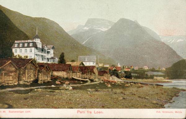 "Parti fra Loen. No. 36 Eneberettiget Fot. Kirkhom, Molde. Postkort frå før 1905. Nausta er som tidlegare, men begge hotella er betydeleg utvida. Byggetrinnet med utsiktstårnet på Alexandra I var ferdig i 1891."