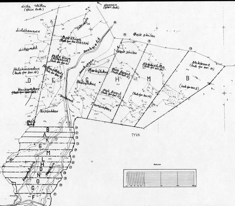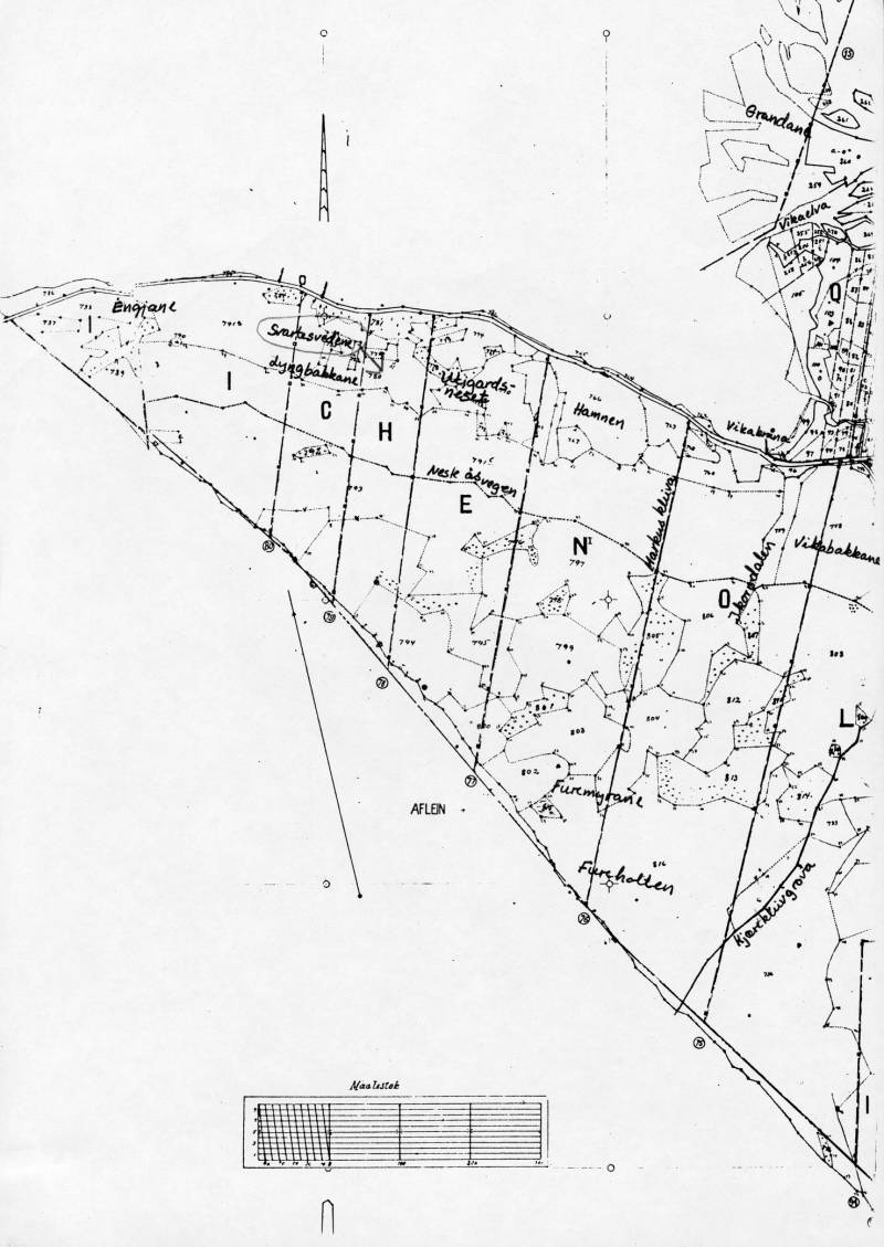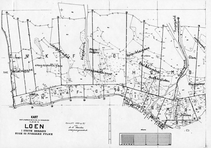 Opp til overordna kapittelUtskiftninga over innmarka i Loen der også Lovik og alt på sørsida av elva var med, tok til i 1960 og vart avslutta i 1965. Det vart vedteke å fløtte 3 ut frå det gamle tunet. Av dei var det 2 som skulle fløtte til sørsida av Loelva. Denne planen vart anka til overskjøn, det vart også anka over boniteringa, og dette vart avslutta i 1968. Det vart no vedteke at 4 skulle fløtte ut frå det gamle tunet. Også i denne planen vart det vedteke av 2 skulle fløtte til sørsida i Lovik. Det var Løndabruket som fekk ein teig frå sjøen og inn over, med undantak av leirplassen som Wilhelm Bødal hadde der, Løndabruket fekk og eit stykke inn til Kvi.tef jellet, det inste stykket av det som var oppteke frå utmarka i utskiftninga i 1928. Austan for Løndabruket sitt stykke ved sjøen, fekk Framigardbruket sin eigedom. Magnebruket fekk hovudstykke vest for riksvegen og postvesen og i aust grensa det til det nye Sjurebruket. Og så fekk dei eit stykke inn ved skulehuset i Loen. Knutebruket fekk sine eigedomar frå grensa mot Hagedalen og vest over.