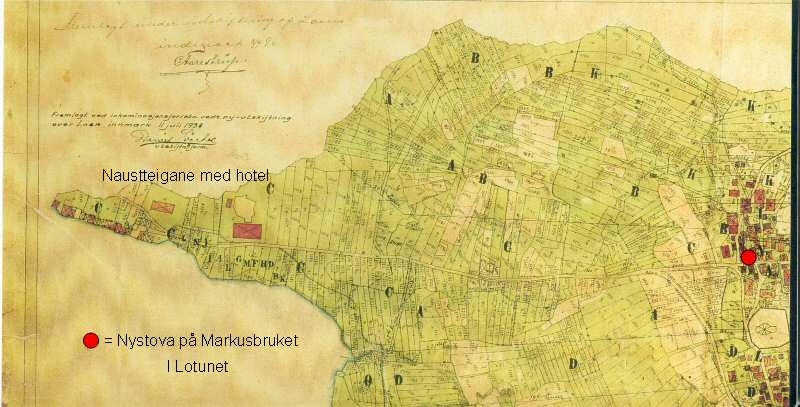 Nedanfor er det utsnitt av jordskiftekart frå 1896 som viser både nystova i Lotunet og dei første hotella.