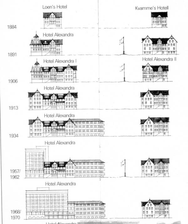 Skissene nedanfor som viser alle utbyggingstrinna, er henta fra boka om hotellet.