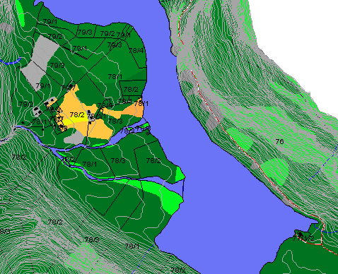 Lokaliseringa av husa på bruket går fram av gardskartet frå dagens ØK(kartid 158) og jordskiftekartet frå 1877 (kartid 161). Det ser ut til at det er teigar merka med B på jordskiftekartet frå 1877 som gjeld bruk 79/1. Før ulukka i 1905 hadde såleis dette bruket den mellomste delen av tunet. Lokaliseringa av teigen der husa stod, går også fram av dagens ØK.