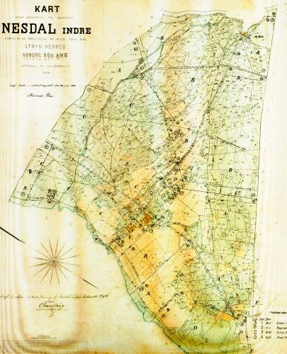 Det var jordskifte på innmarka for garden Nesdal Indre i 1906, med kart oppteke i 1905. I og med at Nesdal Indre ikkje vart teke av båra i ulukka 1905, skulle kartet frå jordskiftet gje eit bilete av det gamle tunet. I følgje dette kartet låg hus langs ein veg som gjekk opp frå vatnet, og ikkje langs med vatnet som for Nesdal Ytre.