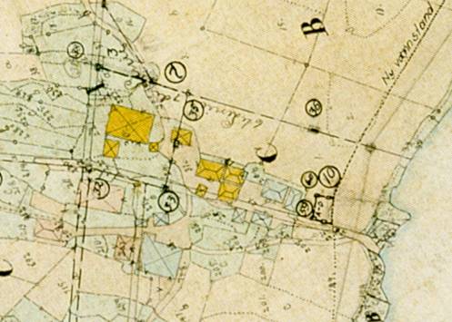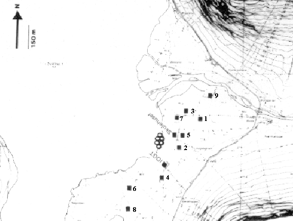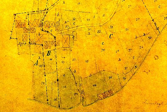 Plassering av tunet etter utskiftninga går fram av bilde og kartskisse i boka til Sigurd Nesdal. På grunnlag av dette har eg teikna inn mogleg tunplassering på utsnitt av ØK på teig som tilhøyrer bruket (sjå kartutsnitt i LOKHIS).