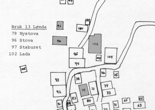 Skissen nedanfor viser husa på Løndabruket før jordskiftet i 1898. (Må sjekke om det var gamlestova frå før jordskiftet i 1898 som stod heilt til tunet vart flytta)