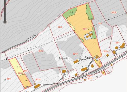 Kartutsnitt med eigedomsteigar, bruksnr og og bygninar.