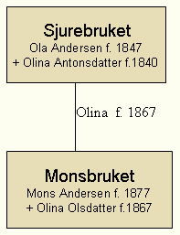 Olina frå Sjurebruket (1867 - 1921) gifte seg med Mons Anderson Loen (1877 - 1948) og kom dermed inn i Monsslekta. Mons var elste sonen til Anders Monsen og Anne Andersdatter på Monsbruket. Han var berre 4 år då faren døde, og då mora gifte seg opp igjen, var det skifte og Mons fekk skøyte på bruket i 1882.