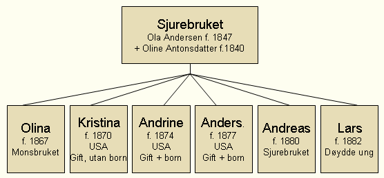 Ola og Olina hadde fekk i alt 8 born. To av desse døydde som spedbarn (Christina f. 1869 og Anders f. 1873 ) og er ikkje med i tekstdelen. Desse namna vart gjevne til born som vart fødde etterpå og viser kor viktig det var å føre namnetradisjonane vidare. Dei borna som voks opp var Olina f. 1867, Kristine f. 1870, Andrine f. 1874, Anders f. 1877, Andreas f. 1880 og Lars f. 1882. Lars døydde ung, medan dei andre 5 vart vaksne og stifta eigen familie.