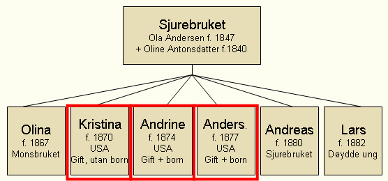 Kristine f. 1874 , Andrine f. 1874 og Anders f. 1877 reiste til Amerika (sjå om dei i bolken om Sjureslekta i Amerika. Del II).