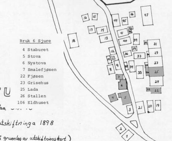 På utskiftningskartet for innmarka i Loen, som var oppteke i 1896 ser vi at Sjurebruket då hadde desse husa heime i Lotunet: Staburet, stove med do inntil vestre koveveggen, nystove, smalefjøs, grisehus,. lade, stall, eldhus. Utan om desse husa hadde dei naust ute ved sjøen, gardfjøs (vår og haustfjøs) inne ved Lofossen, vikalade i Lovik, sel på støylen, skogalade på Kleiva, sel på Høgesætra saman med Antunsbruket og kvernhus saman med Erke, Framigard, Markus og Mons-bruka. I det heile var det 14 hus åleine og 2 saman med andre som høyrde garden til. Desse husa hadde då vore på garden i lang tid, og dei hadde alle frå først av hatt taktekkje av never og torv. Då kartet vart teke hadde nystova fått pannetak av raue panner.